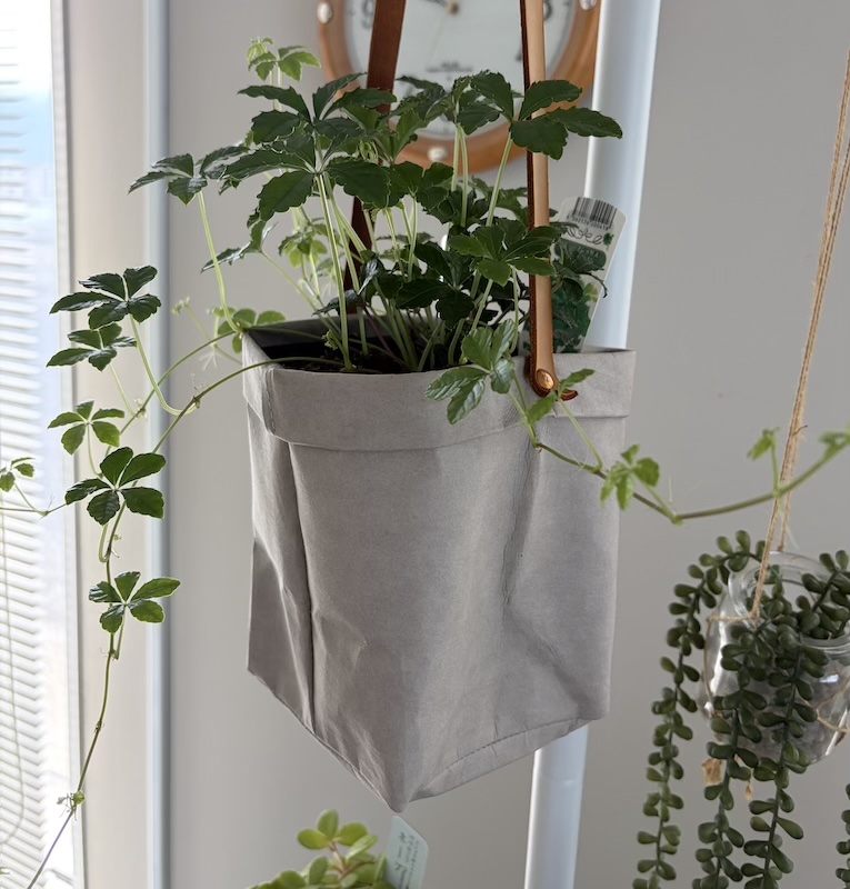 ホームセンターで398円で購入。例の黒いビニルのガワから出してあげて、底面灌水の鉢に植え替え。鉢カバーに入れてハンギングで楽しむことに。